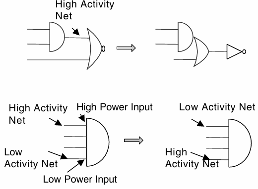 게이트 레벨에서의 최적화 기법은 동적 전력을 줄이는 데 유용합니다: