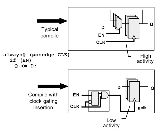 - 최신 라이브러리는 합성 도구에서 인식할 수 있는 특정 클록 게이팅 셀을 제공합니다.