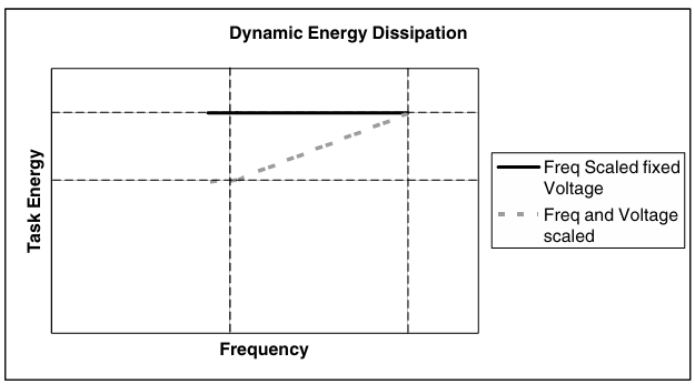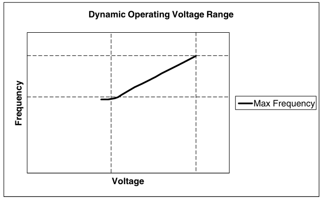 CMOS의 공급 전압을 기술별 범위 내에서 스케일링할 수 있습니다. 게이트 지연, 셋업 및 홀드 시간, 메모리 접근 시간이 제한된 범위 내에서 전압이 감소함에 따라 단조롭게 스케일링됩니다. 전압을 선형적으로 줄이면 동적 전력 소비와 누설 전력이 모두 제곱 법칙에 따라 감소합니다.