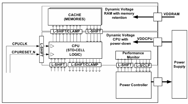 - 독립적 스케일링: CPU를 독립적으로 스케일링하며, 이 경우 레벨 시프터 필요.