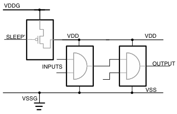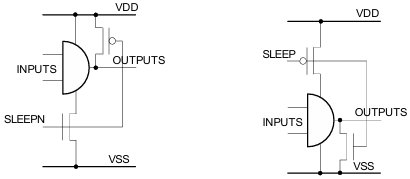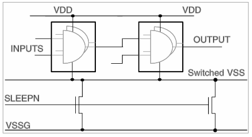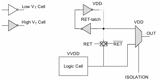 - MT-CMOS: 고-VT 스위치를 사용하여 공급 레일을 차단.