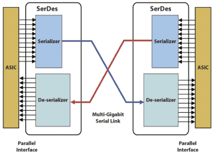 SERDES (Serializer/Deserializer) 는 병렬 데이터를 직렬 데이터로 변환하여 전송한 후, 다시 병렬 데이터로 복원하는 장치입니다. 이를 통해 칩 간 직렬 인터커넥트(serial interconnect) 를 가능하게 하고, 입출력 핀 수와 타이밍 문제를 해결할 수 있습니다.