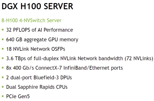 - DGX H100 서버는 72개의 NVLink를 사용하여 GPU 간 3.6TB/s 대역폭 제공