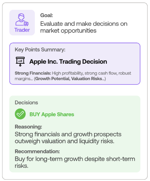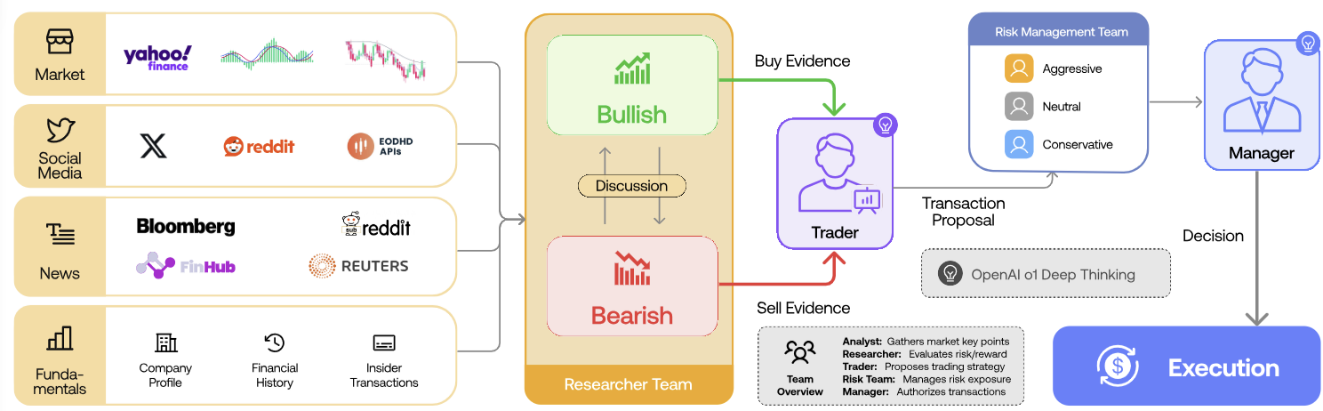 • 분석 팀: 기본, 감정, 뉴스, 기술 분석가들이 그들의 연구와 발견을 그들의 전문 분야에 맞춘 간결한 분석 보고서로 작성한다. 이러한 보고서는 주요 지표, 통찰력, 그들의 전문 분석에 기반한 추천을 포함한다.