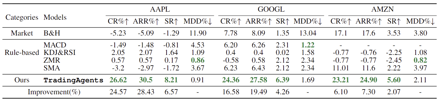 결과는 TradingAgents가 수익과 위험을 균형 있게 조절하는 효과를 강조하며, 이는 지속 가능하고 예측 가능한 투자 성장을 위한 중요한 요소임을 보여준다. TradingAgents는 Buy-and-Hold 및 규칙 기반 전략과 같은 시장 벤치마크를 일관되게 능가하며, 적응성을 입증한다. 수익을 극대화하면서도 통제된 위험 노출을 유지하는 능력은 다중 에이전트 및 토론 기반 자동 거래 알고리즘을 위한 강력한 기반을 마련한다.