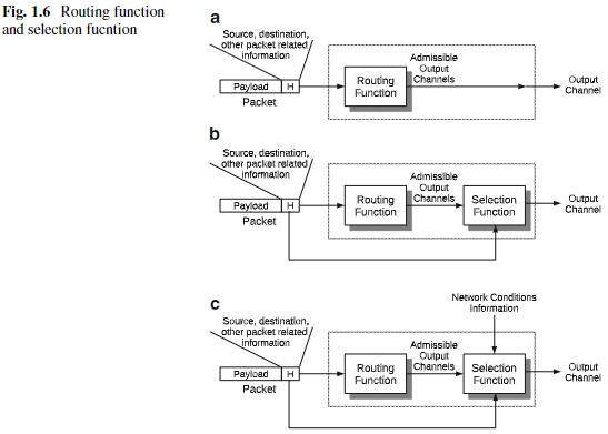 - Adaptive routing을 구현한 router의 selection function은 link utilization, buffer occupation 등의 network status information을 사용한다(Fig. 1.6c).