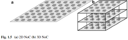 - 3D NoC(Fig. 1.5b): layer들이 수직으로 stacking되며, 층 간 연결(inter-layer connection)이 존재한다.