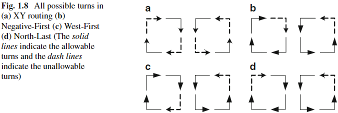 XY는 deadlock을 방지하기 위해 8개의 turn 중 4개를 금지하지만, NF, WF, NL은 단 2개의 turn만 금지한다.