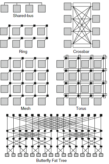 Shared-bus topology는 모든 PE가 공유하는 단일 버스를 통해 통신하는 가장 단순한 방식이다. 하지만 통신량이 많은 애플리케이션에는 shared-bus의 대역폭 제약이 큰 문제가 되며 확장성이 낮다. 이에 대한 보완으로 모든 PE가 양 옆 이웃 두 개를 가지는 ring topology가 제안되었다. 이 구조에서는 메시지가 중간 PE들을 거쳐 최종 목적지까지 전달되며, 대부분의 트래픽 패턴에서 낮은 injection rate에서도 네트워크 포화가 발생한다. Crossbar topology는 모든 PE 간 직접 연결이 가능한 완전 연결 구조이다.