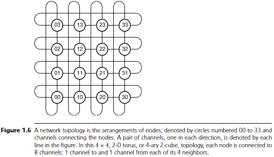 또한 interconnection network는 전용 배선(dedicated wiring)에 비해 매력적인 대안이다. 이는 낮은 duty factor를 가지는 여러 신호들이 제한된 배선 자원을 공유할 수 있게 하기 때문이다. 예를 들어, Figure 1.1에서 각 단말이 100 클럭마다 다른 모든 단말에 1워드씩 통신한다고 하자. 모든 단말쌍 사이에 전용 채널을 제공하면 30개의 단방향 채널이 필요하며, 이 채널들은 99%의 시간 동안 유휴 상태일 것이다. 대신 여섯 개의 단말을 ring network로 연결하면 6개의 채널만 필요하다 (T1→T2, T2→T3, ..., T6→T1). 이 경우 채널 수는 5배 줄고, duty factor는 1%에서 12.5%로 증가한다.