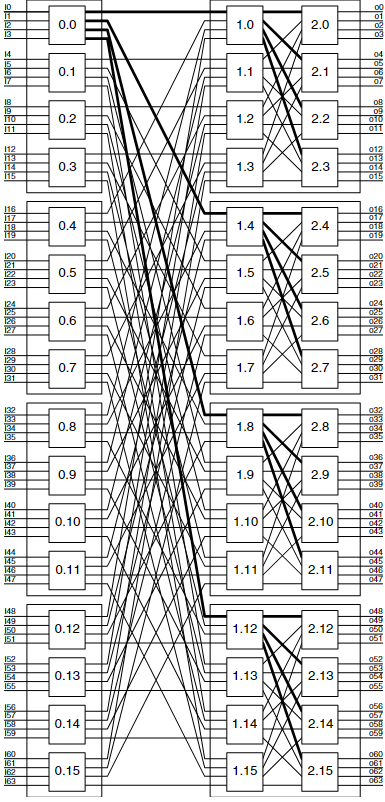한 걸음 물러서서 보면, 이 topology에서 어떻게 모든 입력을 모든 출력에 연결할 수 있는지 확인할 수 있다. 첫 번째 stage의 switch는 나머지 stage가 있는 4개의 circuit board 중 하나를 선택한다. 두 번째 stage는 선택된 board 내의 4개의 chip 중 하나를 선택한다. 마지막 stage는 원하는 출력 포트를 선택한다. 이러한 분할 정복(divide-and-conquer) 구조는 패킷을 라우팅할 때 효율적으로 사용된다.