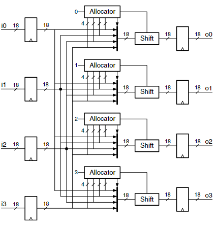 router의 제어는 전적으로 4개의 allocator에 의해 이루어진다. 이들은 각 출력 포트를 제어하며 multiplexer와 shifter를 조작한다. allocator는 4개의 입력 중 하나에 출력 포트를 할당한다.