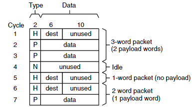 따라서 각 packet은 하나의 H word와 그 뒤를 따르는 0개 이상의 P word, 그리고 0개 이상의 N word로 구성된다. 이를 정규 표현식으로 표현하면 (HP*N*)* 형식이다. 즉, link 위에는 여러 개의 packet이 흐를 수 있으며, 각 packet은 위의 구조를 갖는다.