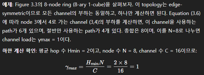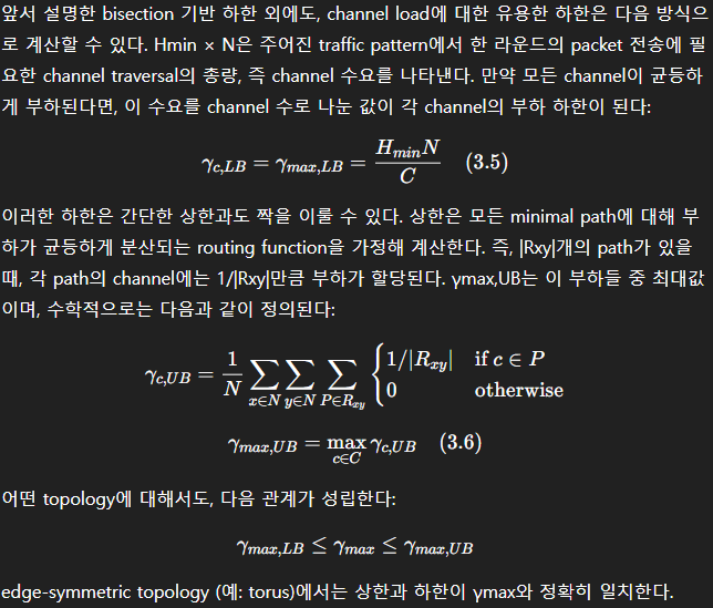 channel c의 load γc는, 해당 channel이 감당해야 하는 bandwidth가 input port bandwidth에 비해 얼마나 되는지를 나타내며, 다음과 같이 정의된다. 이는 모든 input이 1 unit의 traffic을 주입할 때 channel c를 통해 지나야 하는 traffic 양으로 해석할 수 있다. 단위가 없고, 일반적으로는 uniform traffic 하에서 계산한다.