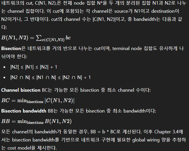 즉, Bisection은 네트워크를 거의 반반으로 나누면서, 그 사이를 연결하는 channel 수가 가장 적은 Cut입니다.
