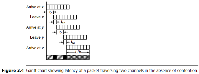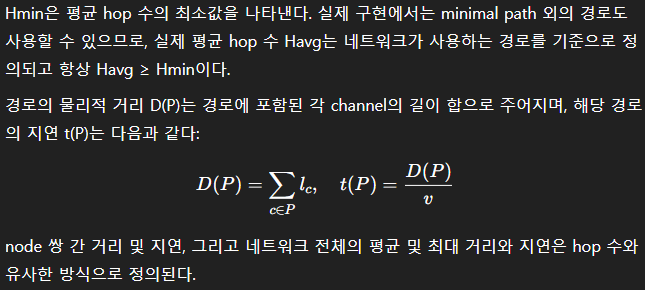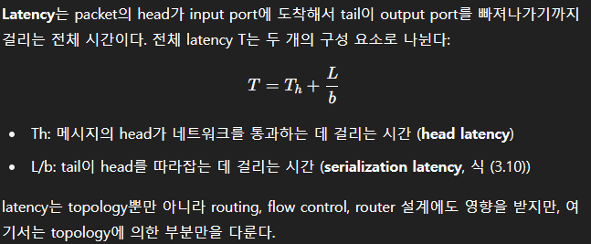 - Equation 3.11에 따라, zero-load latency는 hop 수와 거리(지름)에 비례해 증가한다.
