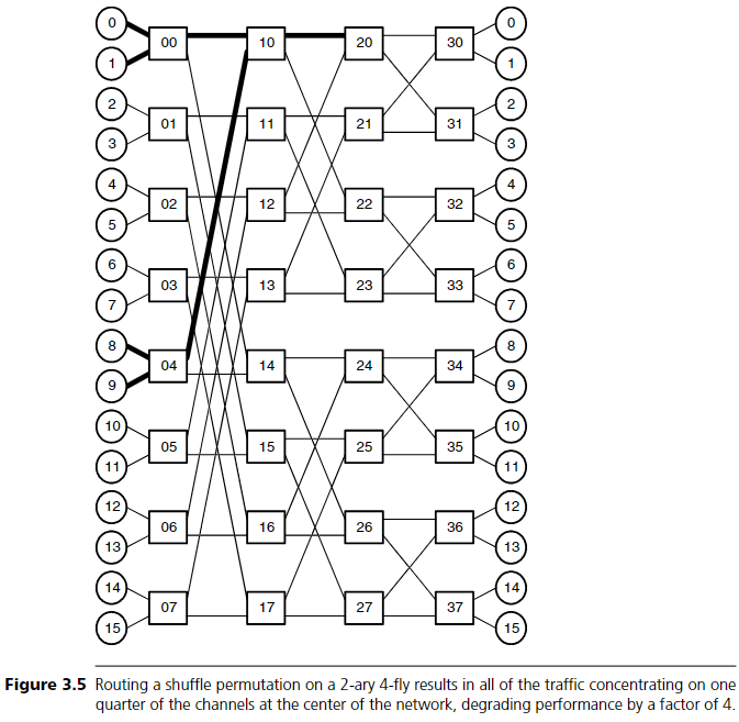 - Indirect network: Figure 3.1(b)의 butterfly에서는 각 node가 terminal(원형) 또는 switch(사각형) 중 하나만 수행한다.