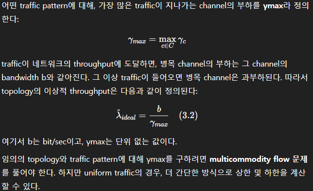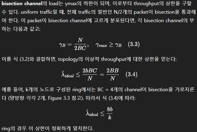 Throughput은 네트워크가 input port당 받아들일 수 있는 데이터 속도 (bit/sec)를 말한다. throughput은 routing 및 flow control에 크게 의존하며 topology만으로 결정되지 않는다. 하지만 routing이 부하를 완벽히 분산하고, flow control이 병목 channel에서 idle cycle이 전혀 없다고 가정하면, topology의 이론적 최대 throughput을 계산할 수 있다.