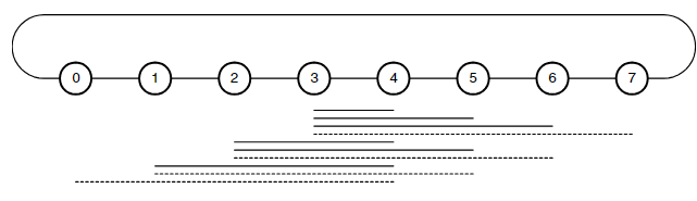 8-node ring에서 각 노드는 ring을 따라 3 hop 떨어진 노드로 트래픽을 보낸다 (즉, node i는 (i+3 mod 8)로 전송). 각 channel의 bandwidth는 1 Gbit/s이고, 각 input은 512 Mbit/s를 전송한다.
