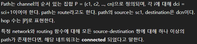 interconnection network의 topology는 node 집합 N과, 이를 연결하는 channel 집합 C로 정의된다. 메시지는 terminal node 집합 N (단, N ⊆ N)에서 생성되고 종료된다. 모든 node가 terminal인 네트워크에서는 단순히 node 집합을 N으로 표현한다.