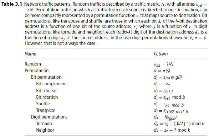 Table 3.1은 interconnection network 평가에 사용되는 일반적인 정적 traffic pattern을 나열한다. 이들 중 일부는 실제 애플리케이션에서 나타나는 통신 패턴에 기반하고 있다. 예를 들어, matrix transpose 또는 corner-turn 연산은 transpose pattern을 유도하고, FFT나 sorting 응용은 shuffle pattern, 유체역학 시뮬레이션은 neighbor pattern을 나타낸다.