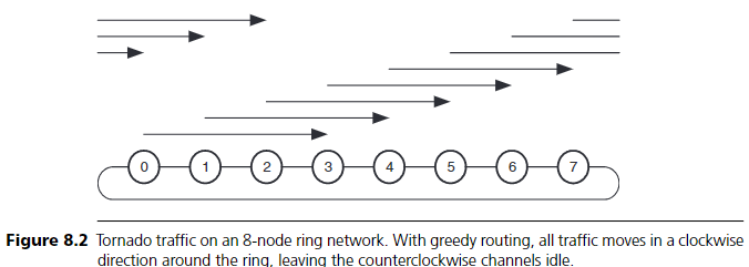 예를 들어, 각 노드 i가 i+3 mod 8로 패킷을 보내는 tornado traffic pattern을 보자. 이때 greedy routing을 사용하면 모든 트래픽이 ring을 시계방향으로만 이동하고, 반시계 방향 채널은 사용되지 않아 부하 불균형이 심해진다. 이로 인해 각 terminal의 throughput은 b/3으로 떨어진다. 반면, random routing에서는 반시계방향 링크에 5/2의 부하가 걸려 throughput은 2b/5가 된다. Weighted random은 전체 트래픽 중 5/8이 3 링크를, 3/8이 5 링크를 지나므로 부하는 각 방향에 대해 15/8이 되고, throughput은 8b/15가 된다. Adaptive routing도 잘 구현된다면 이와 같은 부하 균형을 달성하여 동일한 throughput을 낼 수 있다.