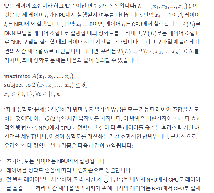 다양한 DNN 모델 레이어는 서로 다른 부동 소수점 연산을 수행하므로, NPU나 CPU에서 실행될 때 처리 시간과 정확도 측면에서 다른 특성을 가집니다. 일부 레이어는 NPU에서의 낮은 정밀도 부동 소수점 연산에 민감하며, NPU에서 실행될 경우 정확도가 떨어집니다. 다른 일부 레이어는 계산 집약적이며, CPU에서 실행될 경우 처리 시간이 길어집니다. 이 논문에서는 모바일 장치에서 NPU를 사용하여 DNN 모델을 실행할 때 이러한 특별한 특성을 식별합니다. 우리는 '최대 정확도' 문제와 '최소 시간' 문제를 정식화하고, 식별된 특별한 특성에 기반하여 해결하기 위한 휴리스틱 기반 솔루션을 제안합니다. 더 구체적으로, 우리는 모델 분할 기술을 제안하여 지연 및 정확도 요구 사항을 충족하기 위해 어떤 레이어를 CPU에서 실행하고 어떤 레이어를 NPU에서 실행할지 결정합니다.