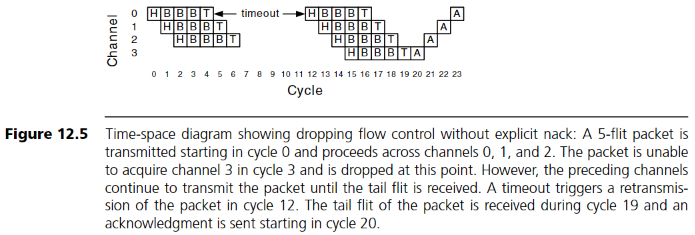 그림 12.5는 이를 보여준다. 패킷은 처음 전송에서 채널 3 할당에 실패하지만, NACK 없이 채널 0~2까지는 계속 전송되고 tail flit이 통과할 때 자원을 해제한다. 따라서 채널 0, 1, 2는 각각 cycle 5, 6, 7에 해제된다.