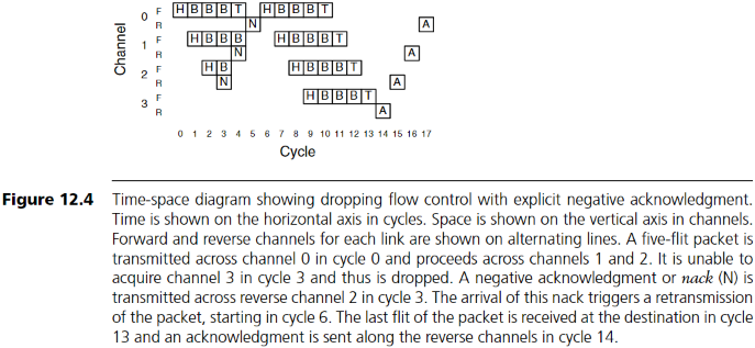 그림 12.4는 그림 12.3(b)의 드롭 방식 flow control에 대해 explicit negative acknowledgment(NACK)를 사용하는 time-space 다이어그램이다. 이 도표는 Gantt 차트처럼 수직 축에는 자원(채널)의 사용을, 수평 축에는 시간을 나타낸다. 다이어그램에서는 5-flit 패킷이 4-hop 경로를 따라 전송되는 과정을 보여준다. 수직축에는 네 개 채널(03)의 forward(F) 및 reverse(R) 방향이 교차로 표시되고, 수평축은 flit cycle(017)을 나타낸다. 첫 번째 전송에서 패킷은 채널 3을 할당받지 못해 드롭되며, 이로 인해 NACK가 reverse 채널을 통해 source로 전달되고, 그에 따라 재전송이 시작된다.
