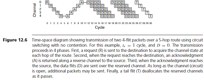 5-hop 경로 상에서 두 개의 4-flit 패킷을 circuit switching으로 전송한 time-space 다이어그램이다. 경합은 없으며, tr = 1 cycle, D = 0이다. 전송은 네 단계로 이루어진다.