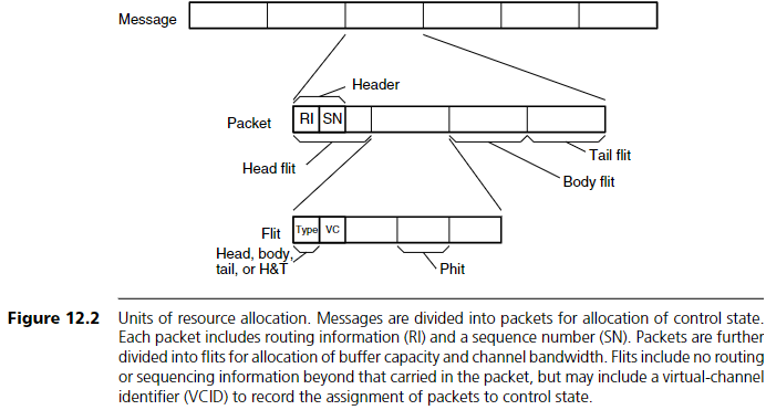 자원 할당의 효율성을 높이기 위해, message를 control state 할당 단위인 packet으로 나누고, channel bandwidth 및 buffer capacity 할당 단위인 flit으로 다시 나눈다.