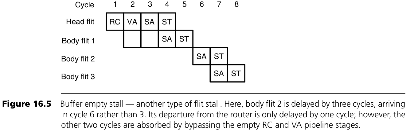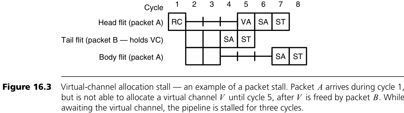 그림 16.2에서 보는 바와 같이 RC와 VA는 head flit에만 적용되며, SA와 ST는 모든 flit에 대해 적용된다. stall이 없는 경우 각 flit은 앞선 flit보다 한 사이클씩 늦게 파이프라인에 진입하고 각 단계마다 한 사이클씩 진행된다.