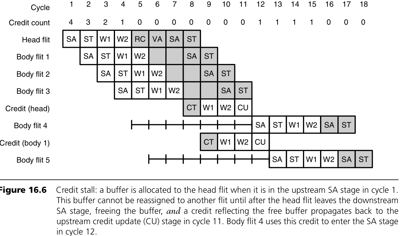 head flit이 virtual channel 할당을 받고 있는 동안 첫 번째 body flit은 RC 단계에 있으며, head flit이 SA 단계에 있을 때 첫 번째 body flit은 VA 단계, 두 번째 body flit은 RC 단계에 있다. 하지만 routing과 virtual-channel allocation은 패킷 단위로 처리되므로, body flit은 해당 단계에서 수행할 작업이 없다. body flit은 해당 단계를 우회할 수 없고 순서를 유지해야 하므로, SA 단계에 도달할 때까지 input buffer에 저장되어야 한다. stall이 없다면, 파이프라인에 동시에 세 개의 body flit이 존재하므로 최소 세 개의 입력 buffer 위치가 필요하다. 이후 credit stall을 방지하기 위해 더 큰 buffer가 필요함을 설명할 것이다.
