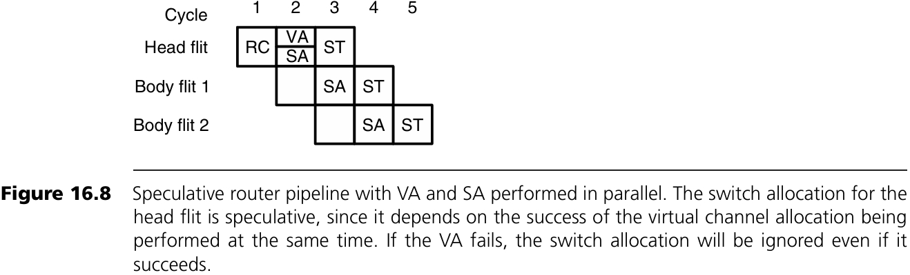 Figure 16.8은 virtual-channel allocation(VA)과 switch allocation(SA)을 동시에 수행하는 speculative router pipeline을 보여준다. 이 경우 head flit에 대한 switch allocation은 추측(speculative)이며, VA가 성공할 때만 유효하다. VA가 실패하면 SA가 성공하더라도 무시된다.