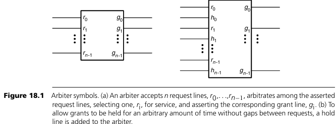 버퍼, 채널, 또는 스위치 포트와 같은 자원이 여러 agent에 의해 공유되는 경우, arbiter는 이 자원에 대한 접근 권한을 한 번에 한 agent에게만 할당해야 한다. 그림 18.1(a)는 crossbar switch의 입력 포트와 같은 자원에 대해 연결된 virtual channel들이 접근을 요청할 때 사용하는 n-input arbiter의 기호를 보여준다. 전송할 flit을 가진 각 virtual channel은 자신의 request line을 assert하여 입력 포트 접근을 요청한다. 예를 들어, n = 8개의 VC 중에서 VC 1, 3, 5가 각각 r1, r3, r5를 assert했다고 하자. 그러면 arbiter는 이들 중 하나, 예컨대 VC 3을 선택해 g3을 assert함으로써 입력 포트를 VC 3에게 grant한다. VC 1과 5는 arbitration에서 패배하여, 나중에 r1과 r5를 다시 assert해야 한다. 일반적으로 이들 line은 grant를 받을 때까지 계속 high 상태를 유지한다.