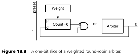 그림 18.8과 같이, weighted round-robin arbiter는 각 요청자가 자신에게 할당된 quota를 초과했는지를 판단하는 회로를 arbiter 앞단에 배치하여 구성할 수 있다. 이 그림은 1비트 슬라이스를 보여주며, 이 회로는 weight 레지스터, 카운터, AND 게이트, 일반 arbiter로 구성된다.