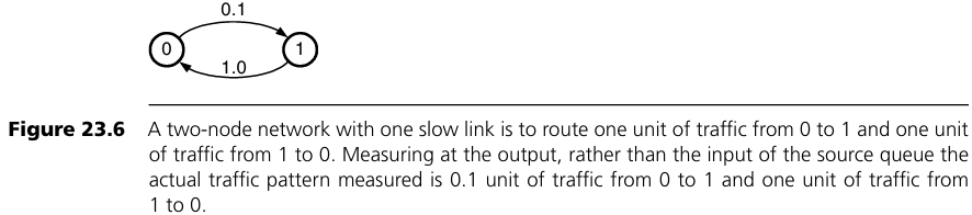 예를 들어 그림 23.6의 네트워크를 보자. 두 목적지에 도달한 traffic의 평균을 내면, 1과 0.1의 평균인 0.55 단위에서 saturation이 일어난다고 결론 내릴 수 있다. 그러나 실제로 네트워크는 아래와 같이 전달하고 있다: