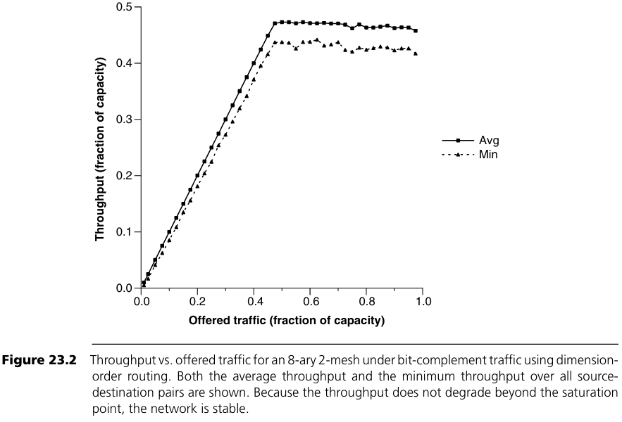 throughput은 일반적으로 네트워크 용량의 일부로 표현된다. 이렇게 하면 네트워크의 성능을 더 직관적으로 이해할 수 있으며, 크기나 topology가 다른 네트워크 간의 비교도 가능하다. 예를 들어, 그림 23.2의 8-ary 2-mesh 네트워크의 총 용량은 U^,M=4b/k=b/2\hat{U},M = 4b/k = b/2이다. 여기서 b는 channel bandwidth이다. 모든 source가 동일한 양의 traffic을 생성한다고 가정하면, 각 source는 bλ/2b\lambda/2의 속도로 packet을 생성하며, 여기서 λ는 전체 용량 대비 offered traffic 비율이다. saturation은 이 용량의 43%에서 발생한다.