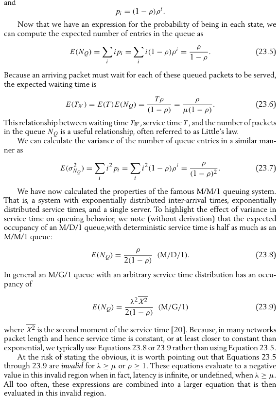 이처럼 service time의 분산이 커지면 대기 시간도 증가한다. 이는 긴 service time을 가진 packet들이 전체 busy 시간에서 더 많은 비율을 차지하기 때문이다. multistage network를 분석할 때는 각 단계마다 분산이 다를 수 있다. 예를 들어, 그림 23.12의 switch는 deterministic한 출력 service time을 갖지만, 여전히 non-zero variance를 가진다.