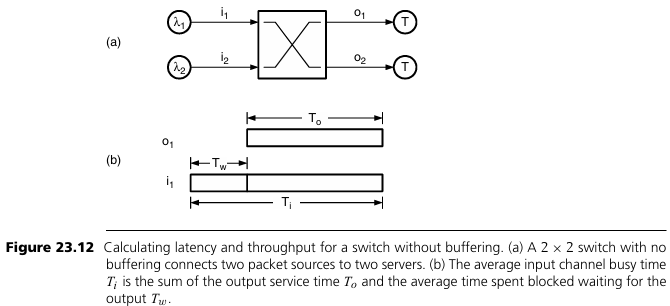 예를 들어, 그림 23.12(a)와 같은 blocking flow controlqueuing이 없는 2×2 switch를 생각해 보자. 각 출력 포트의 service time은 같고, deterministic하며, To로 설정한다. 두 입력의 traffic rate는 동일하며, λ₁ = λ₂ = λ이고, 양쪽 입력에서 나오는 traffic은 두 출력에 대해 균일하게 분포되어 있다고 가정한다. 즉, λᵢⱼ = λ / 2 (∀i, j).