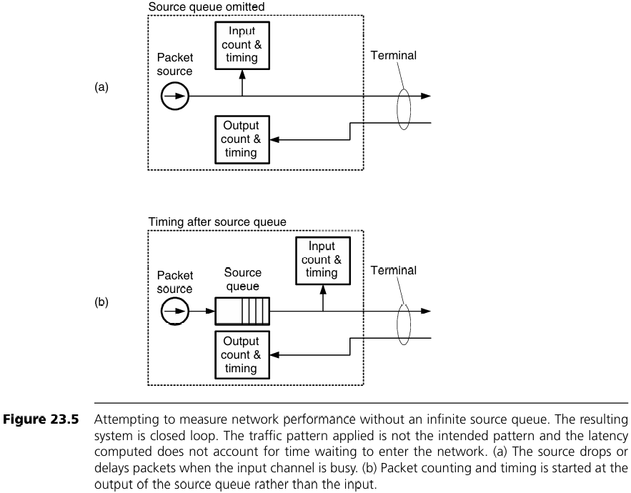 그림 23.5는 무한한 source queue 없이 네트워크 성능을 측정하려는 시도를 보여준다. 결과 시스템은 closed loop가 되며, 적용된 traffic pattern은 원래 의도한 패턴이 아니게 되고, 측정된 latency는 네트워크 진입을 대기한 시간을 포함하지 않는다.