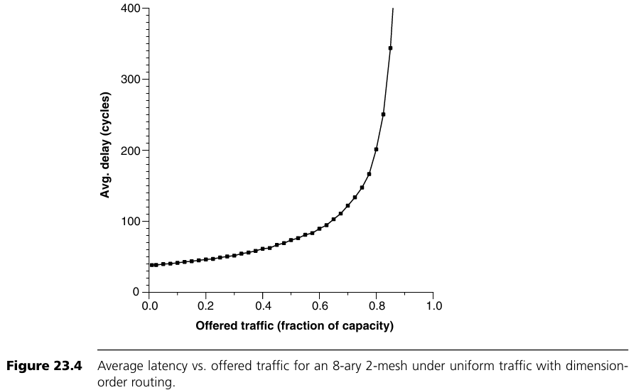 traffic이 증가함에 따라 contention도 증가하면서, packet은 buffer와 channel을 기다리게 되어 latency가 상승한다. 결국 offered traffic이 saturation throughput에 접근하면 latency 곡선은 수직 점근선에 근접하게 된다. 이 곡선의 형태는 기본적인 queuing theory (23.2.1절 참조)로 설명할 수 있다.