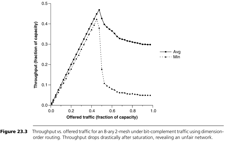 네트워크 불안정성은 종종 네트워크 내의 fairness 문제로 인해 발생한다. 과거에는 saturation 이후 평균 throughput만을 보고하는 경우가 많았으며, 이는 X에 대해 가산점을 주는 셈이다. 하지만 모든 flow 중 최소 throughput을 보고하면, 어떤 flow가 starvation되고 있는지를 확인할 수 있다. starvation은 일반적으로 unfair flow control의 결과이다. 그림 23.2에서는 saturation 이후에도 accepted traffic이 거의 일정하므로, 네트워크가 각 flow에 bandwidth를 공정하게 할당하고 있다고 볼 수 있다. 반면 그림 23.3에서는 saturation 이후 throughput이 급격히 감소하는데, 이는 flow control이 불공정하다는 것을 시사한다.