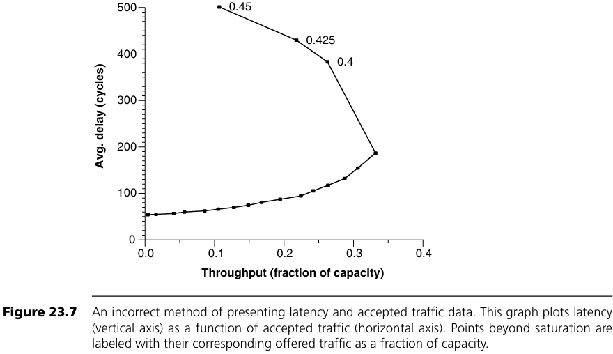 이런 형태의 가장 큰 문제점은 source queue가 측정에 포함되지 않았다는 것을 드러낸다는 점이다. source queue를 고려했다면, saturation을 초과한 모든 offered traffic에서 latency는 무한대가 되어야 하며, 곡선은 wrap-around되지 않고 최대 accepted traffic에서 점근선 형태로 끝나야 한다.