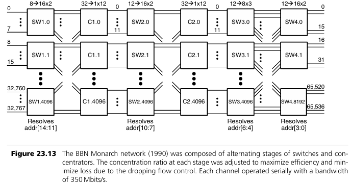 그림 23.13에 보이는 BBN Monarch 네트워크(1990)는 switch와 concentrator를 번갈아 배치한 stage들로 구성되어 있다. 각 stage에서의 concentration ratio는 효율성을 극대화하고 dropping flow control로 인한 손실을 최소화하기 위해 조정되었다. 각 채널은 직렬(serial) 방식으로 작동하며, 대역폭은 350 Mbit/s였다.