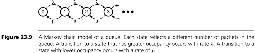 그림 23.9의 Markov chain은 큐의 상태 전이를 나타낸다. 각 원은 큐의 상태를 나타내며, 해당 상태에서 큐에 존재하는 packet 수로 라벨링된다. packet은 λ의 속도로 큐에 도착하고, 이에 따라 상태는 오른쪽으로 전이된다. 반대로 packet이 큐에서 제거되면 μ의 속도로 왼쪽 상태로 전이된다.