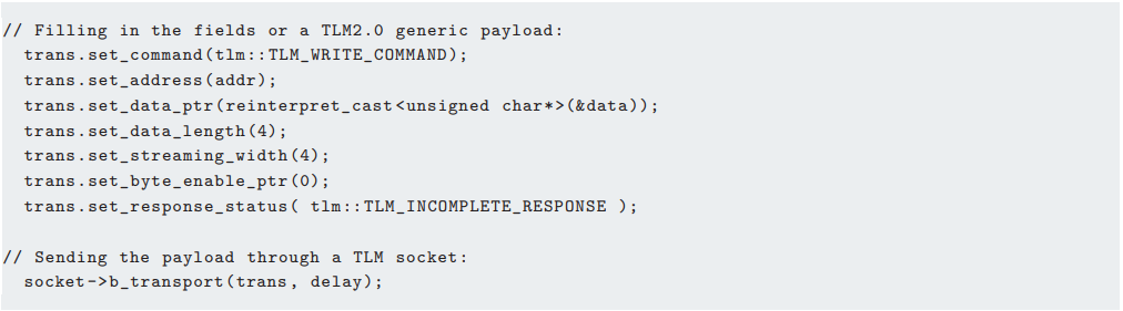 소켓 자체는 어떤 유형의 payload도 처리할 수 있지만, C++의 강력한 타입 검사는 모든 연결된 사이트가 일치하도록 보장합니다. 캐시 라인, USB 요청 블록(URBs), 802.3 네트워크 프레임, 오디오 샘플과 같은 형식이 일반적인 예입니다. Generic payload는 사용자 정의로 확장할 수 있으며, 중간 버스 브리지 및 라우터는 모든 확장을 알 필요 없이 다형성(polymorphism)을 가질 수 있습니다. Generic payload는 버스트 전송 및 바이트 레이닝(byte laning)과 같은 고급 기능을 포함하지만, 명령 필드는 읽기와 쓰기만을 다루는 열거형을 사용합니다. 이 명령 세트는 현대 SoC interconnect에서 사용하는 풍부한 명령 세트에 비해 매우 부족하므로 실제 사용에서는 비표준 확장이 항상 필요합니다.