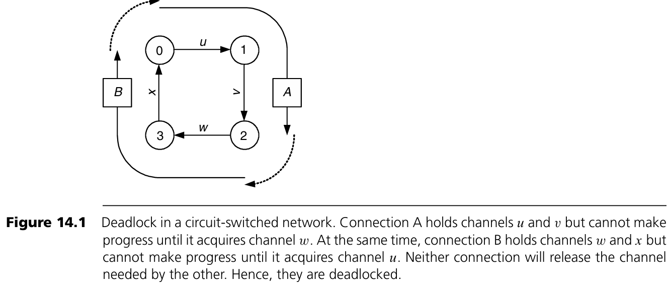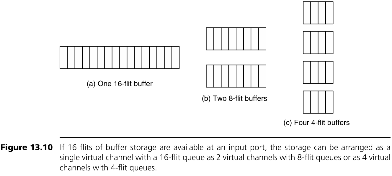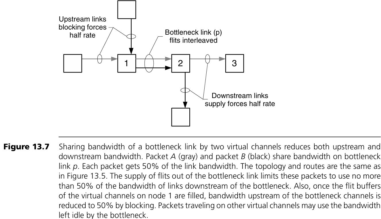 이는 마치 각 목적지마다 별도의 차선을 가진 도로와 같다. 경기장으로 가는 차들은 해당 차선에서 정체되어 있지만, 식료품점으로 가는 차는 별도의 차선을 통해 문제없이 진행된다. interconnection network의 장점은, 비용이 저렴한 buffer 같은 자원은 복제하고, 고비용인 bandwidth는 공유함으로써 이런 격리를 구현할 수 있다는 것이다. 불행히도 도로와 자동차에는 이 방법을 적용할 수 없다.