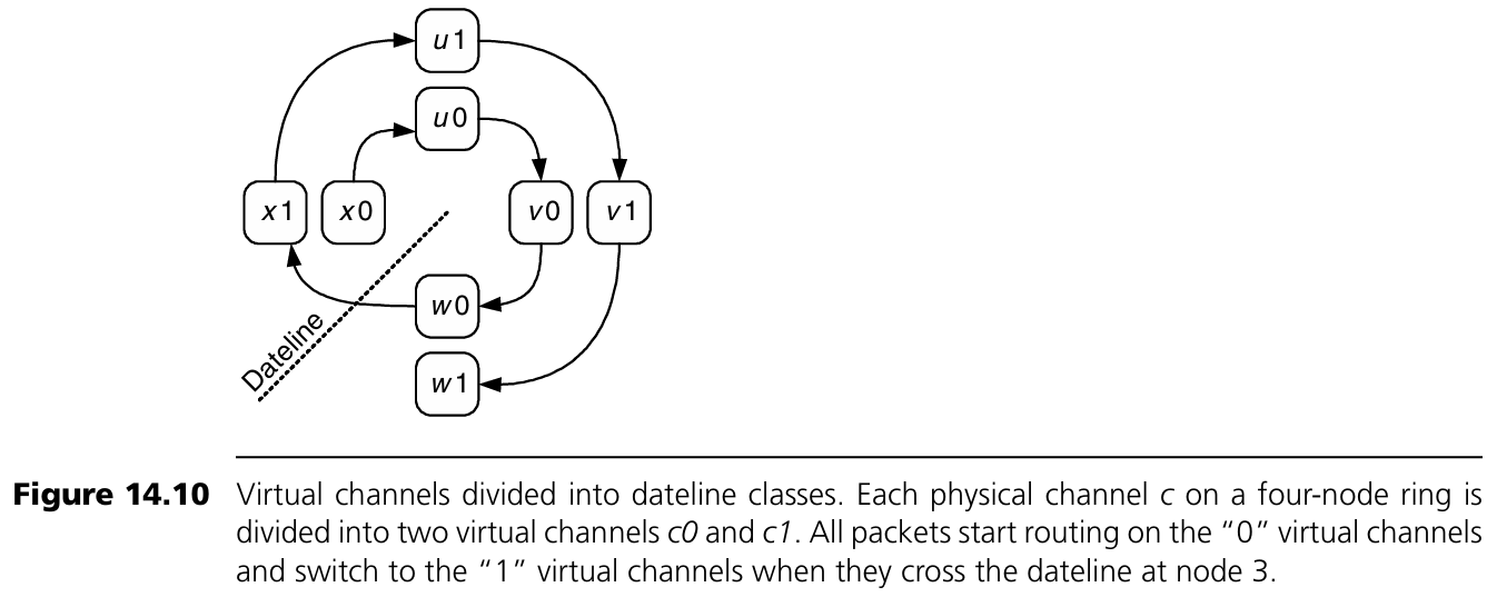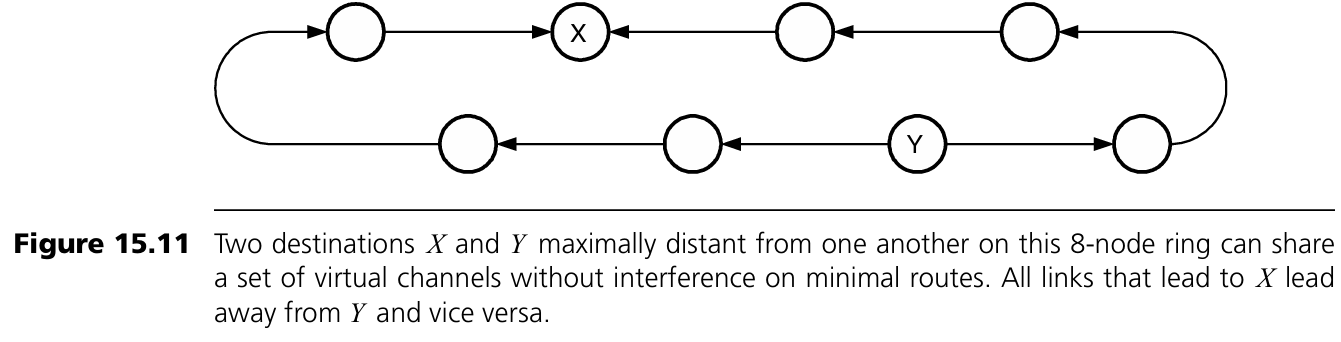 TSR은 2개의 traffic class를 가진 512개의 노드를 512개의 virtual channel만으로 지원하기 위해, 거리상 최대한 멀리 떨어진 두 노드는 최소 경로를 기준으로 공통 physical channel을 사용하지 않음을 이용한다. 따라서 두 노드는 같은 virtual channel 번호를 사용하더라도 간섭이 없다. 그림 15.11은 8-node ring에서 이를 설명한 예다. 노드 X로 가는 패킷은 화살표 방향의 링크만 사용하고, 노드 Y로 가는 패킷은 반대 방향 링크만 사용한다. 따라서 경로가 겹치지 않기 때문에 같은 virtual channel을 사용해도 문제가 없다.