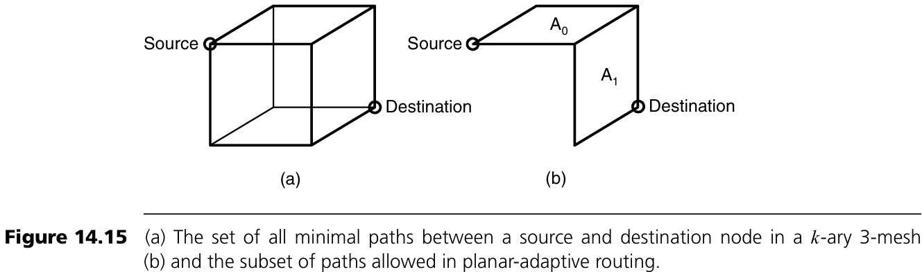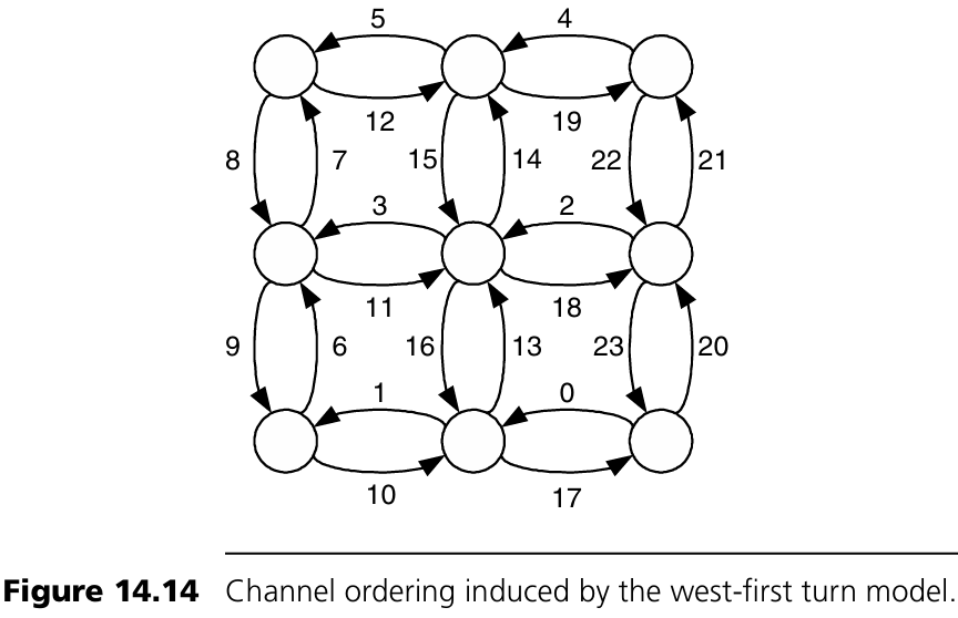 해결책은 각 목적지에 대해 별도의 virtual network를 제공하는 것이다. Avici TSR은 이를 실현하며, 두 개의 traffic class에 대한 differentiated service까지 제공한다. TSR은 각 physical channel당 512개의 virtual channel을 제공하며, 목적지 d마다 해당 방향의 모든 링크에 대해 두 개의 virtual channel을 예약한다. 하나는 일반 트래픽용, 다른 하나는 premium 트래픽용이다. 또한 source queue도 목적지와 서비스 class별로 분리되어 있어, source queue에서도 간섭이 발생하지 않는다. 이 구조에서는 A로 가는 트래픽이 B로 가는 트래픽과 virtual channel이나 buffer를 공유하지 않기 때문에 간섭이 발생하지 않는다. bandwidth만 공유할 뿐이며, 그 외 자원은 공유되지 않는다.